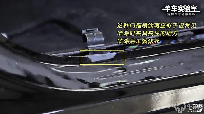 关于车门框的喷涂瑕疵,似乎每次拆车都能遇到。的确,很少有工厂会处理这个细节。喷涂时因为有夹具的存在,导致漏喷,不做修补也不会有什么问题,只是能反应出厂家的态度。