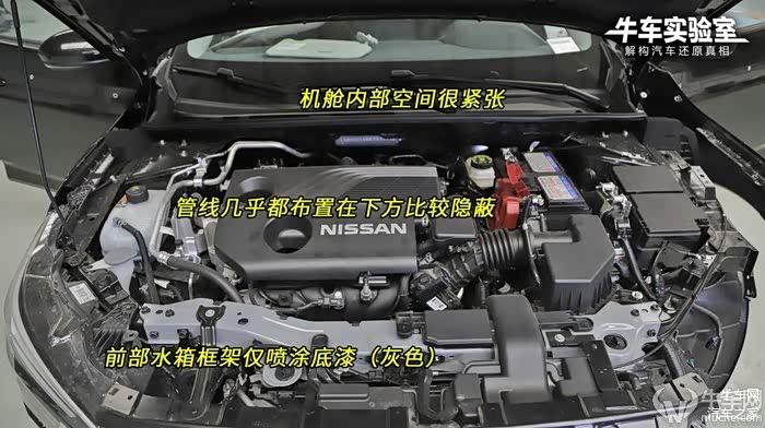 轩逸的发动机舱布局显得满满当当,基本上没有什么空余的地方。各种管线的布置也都在比较隐蔽的地方,这种设计也是比较少见的,给机舱留下的散热空间就不多了。水箱框架的金属表面只有底漆,没有喷涂色漆,和前杠如出一辙。该区域长期承受高温和外界灰尘侵蚀,极易被腐蚀,底漆(即防锈漆)本身很薄,缺少了色漆层的保护,能否禁得住日久天长的使用,不得而知。