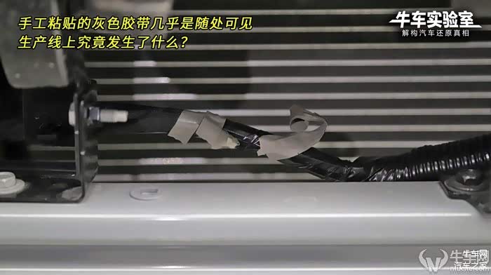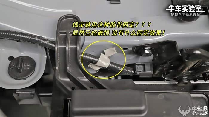 接下来说的这个就比较令人不能理解了,机舱内很多人工粘贴的灰色胶布,用来固定线束。可是它们实际上根本没有任何作用,因为根本不粘,而且都破损了。类似的设计,在后面的文章里也会涉及,地板下也发现了几处这种胶带。