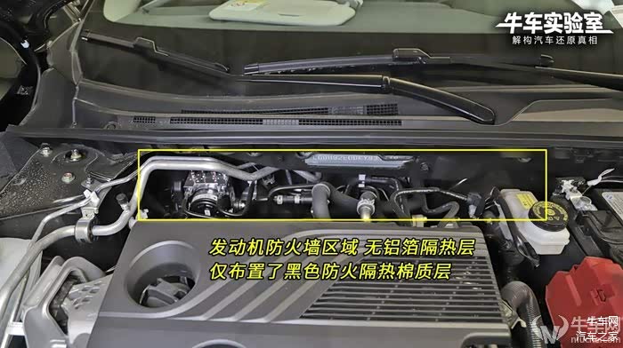 此外,发动机舱防火墙区域(即靠近前风挡的地方)没有安置厂家的铝箔板隔热层,仅铺设了黑色的隔热棉质层,兼具阻燃的作用。不如铝箔+隔热棉双防护完善。而此处布置的管线也比较多,一般来说此区域应该比较空旷。整体观察发现,机舱内组件确实有点拥挤,1.6L自然吸气发动机本身技术比较老旧,并没有优化体积,而新车的外形是迎合消费者口味的最新设计,似乎就是这样造成了“不兼容”,小机舱塞进个大体积发动机。
