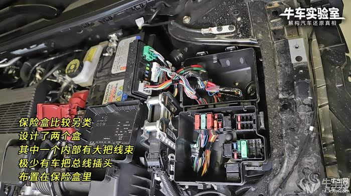 在发动机舱右侧的双保险盒里,发现其中一个还塞进了大量的线束,令人比较意外。一般来说,极少有车把总线放在这个地方的,显得凌乱不堪。而且线束也没有任何防护措施,保险丝反而成了配角,因为这里面根本没有多少保险丝。