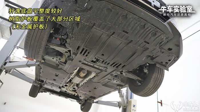 轩逸的底盘几乎全覆盖了树脂护板,未发现金属材料覆盖件,符合这个价位产品的用料。发动机下护板未预留保养维护窗口,拆解时螺丝特别多,比较麻烦。