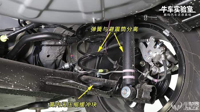 避震筒与弹簧分离式设计,已经成为业内不成文的通行设计。虽然理论上讲有利于调节操控性能,但真正在这方面下功夫的产品非常罕见,轩逸也并没有为后悬挂进行什么精良的调教。而理论上分离式设计更占空间的说法,现在似乎也站不住脚了。弹簧的长度被刻意缩短后,其实上半部分已经不再多占空间了。簧内没有压缩缓冲块,在满载行驶极限时,可能会产生不舒适感。