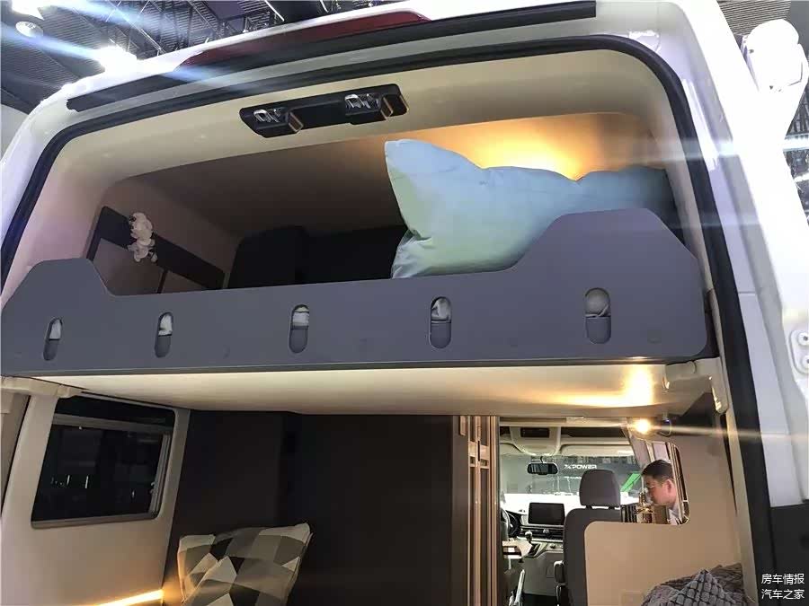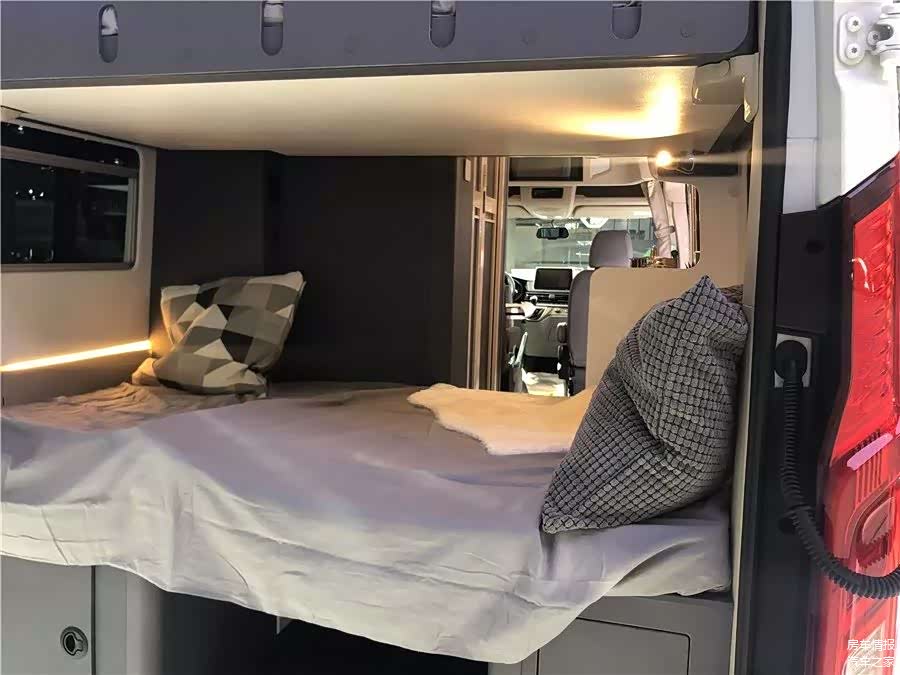 车厢的车尾布置着一张尺寸为1800*1060(mm)的横置床,空间足够一个成年人休息。上方还有一张尺寸为1650*1030(mm)的升降床,成年人睡会比较局促,小编建议睡小孩比较合适。在行驶时,将横置床翻起,可以得到一个较大的纵向空间,可以用来存放自行车等物品。