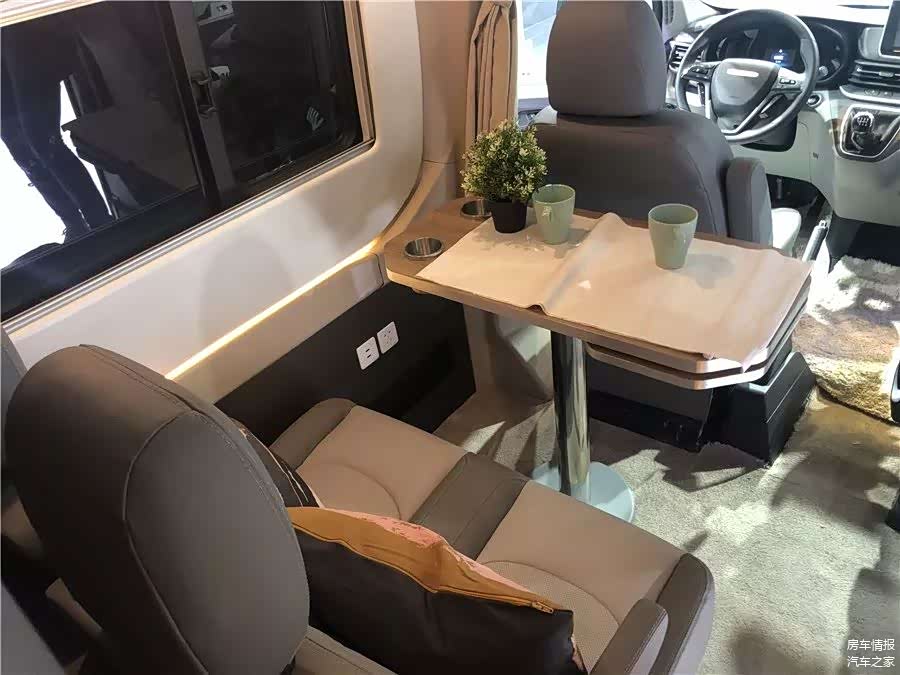 这台车的内饰有“都市风”和“田园风”两种可选,布局有4座4卧、5座4卧两种可选。大家看到的这辆是4座4卧都市风的车型。整个内饰大面积采用黑白灰三色,显得简洁明亮。将主副驾驶座椅旋转过来,就可与第二排座椅形成一个4人会客区,以供用户聚餐会客之用。在需要休息时可将餐桌收起,放倒座椅便可形成一个拼床,可供两个成年人休息使用。会客区上方的储物吊柜还可以存放大量的随车行李。