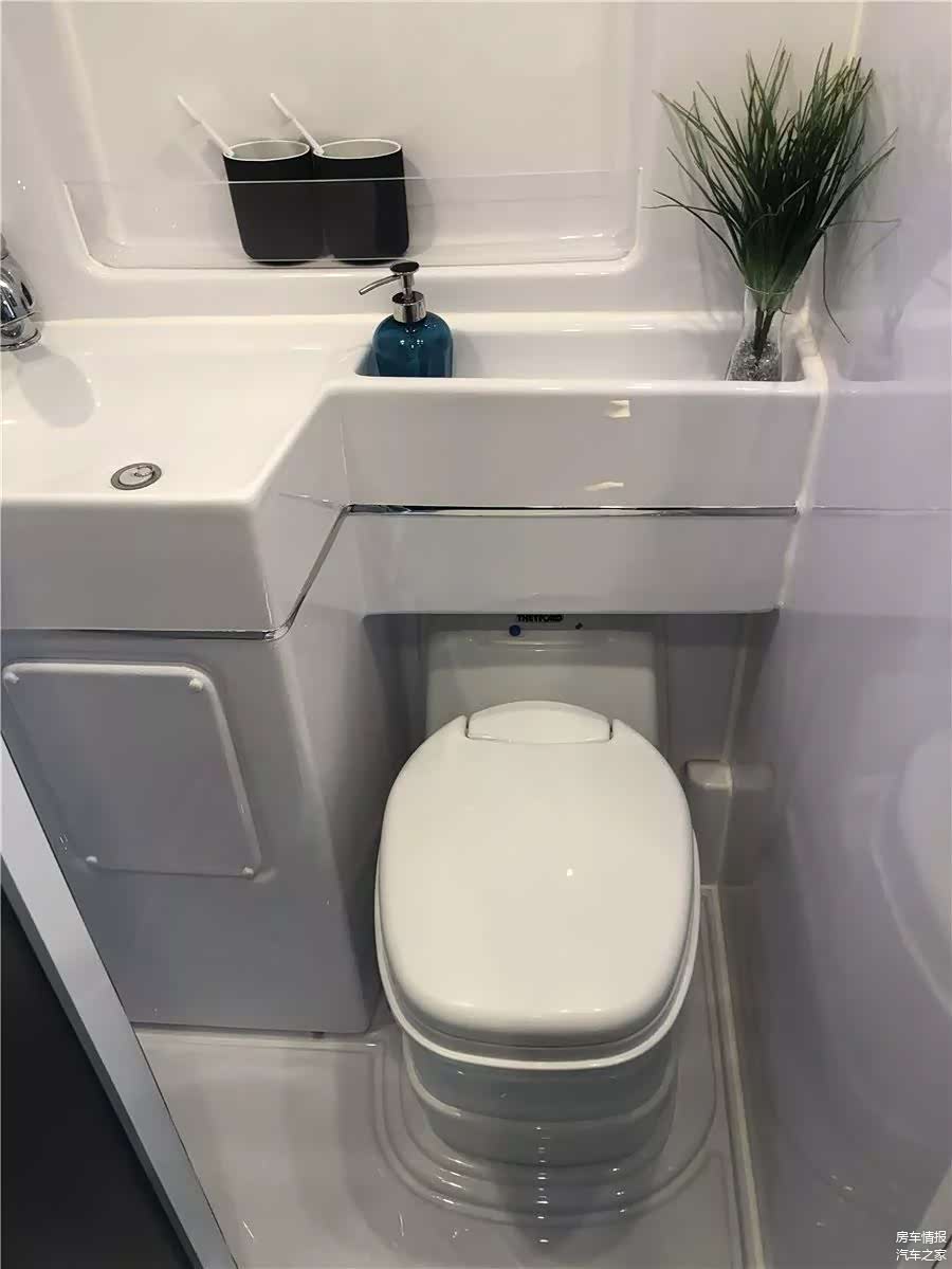 厨房区对侧是一体式卫浴间,配备一体式洗脸盆、抽拉式淋浴头、盒式坐便器、换气扇、化妆镜柜、置物台、衣架,配置非常齐全,卫浴间的空间也是同级别最大,让用户可以体面地解决洗漱问题和如厕问题。