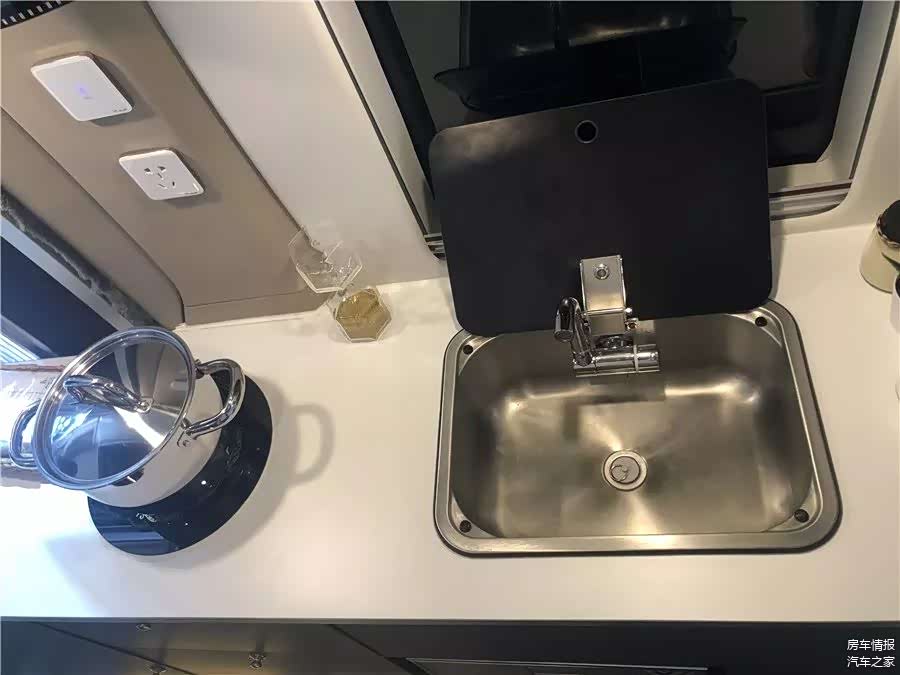 靠近中门的是这台车的厨房区,厨台上安装了1200W的电磁炉、集成式洗菜池,再加上外置卡式炉,做饭不用愁,厨台下方配备了自锁储物抽屉和一台50L的车载冰箱,各种餐厨具有地儿放,食材也可以很好地保鲜。