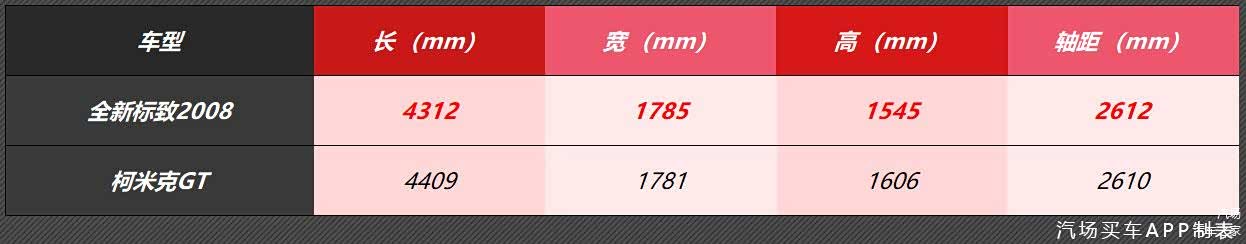 两款车型相比,整体车身尺寸相差并不是很大,不过柯米克GT的长度和宽度要比全新标致2008更富裕一些,而全新标致2008要比柯米克GT轴距长一些。
