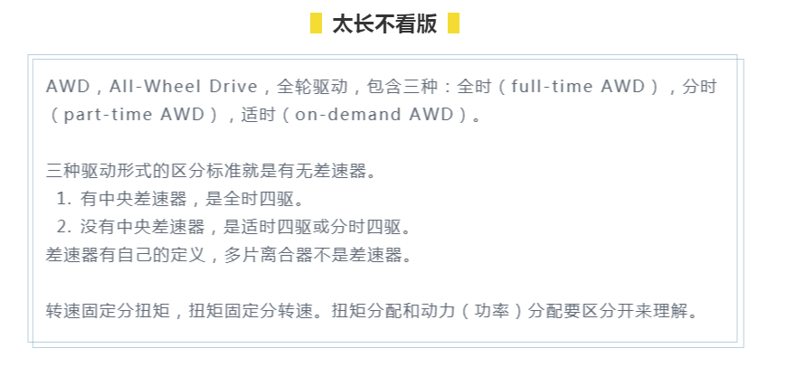 SAE对全轮驱动(包括四驱)有完整的定义和完善的分类,算是业内权威(之一?有其他标准的欢迎拿来讨论)。