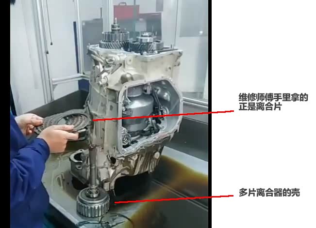另一个维修视频的截图就更明显了,维修工已经把多片离合器拆下来了,手里拿的正是那些摩擦片。