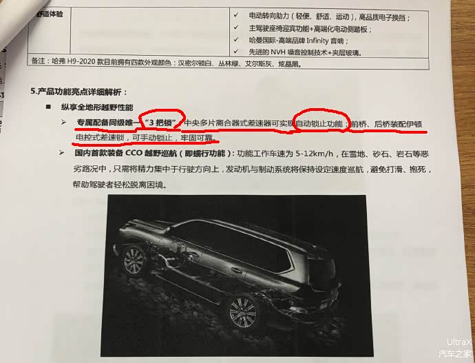 后来在微博上我看到了一份官方宣传资料,是为参加试驾活动的各位媒体老师准备的。从这张纸上可以看出,不论是三把锁的加引号写法,还是对其的描述,哈弗官方还是比较谨慎的。(就别管那个愚蠢的“中央多片离合器式差速器”的称呼了)