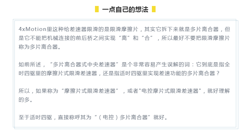 超选用的是粘性联轴节来限滑,4xMotion用的是摩擦片来限滑。有的人看到途锐的4xMotion的摩擦片,以为那是“多片离合器”,是不对的。