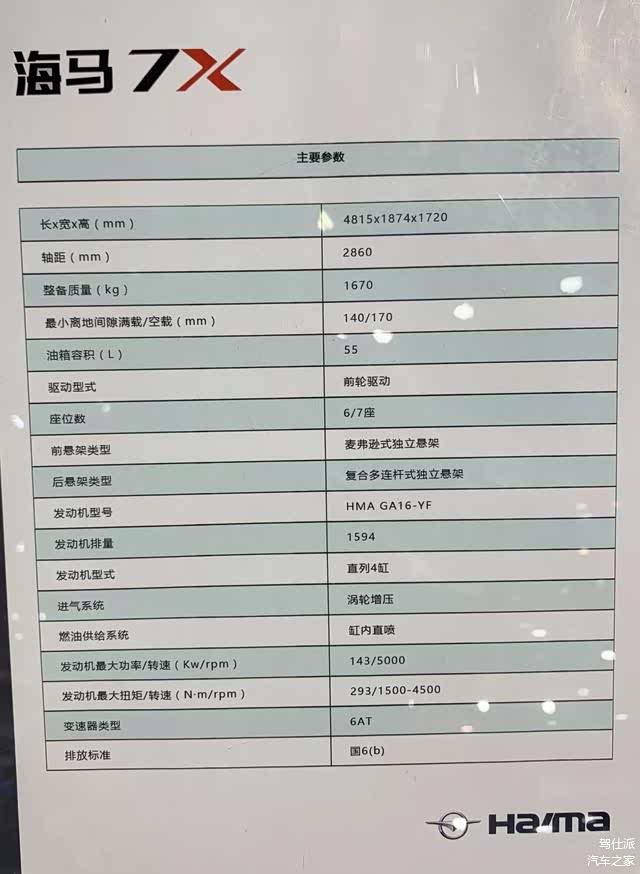 海马7X目前可以确定将搭载自己当家的1.6T发动机,继续延续“强动力”这一品牌口号。这款HMA GA16-YF 1.6T直列四缸涡轮增压发动机,采用缸内直喷技术,最大功率143kW/5000rpm、最大扭矩293N·m/1500-4500rpm,匹配6AT变速箱,动力系统达到国六B标准。底盘方面,前悬挂为麦弗逊式独立悬架、后悬架为复合多连杆式独立悬架。