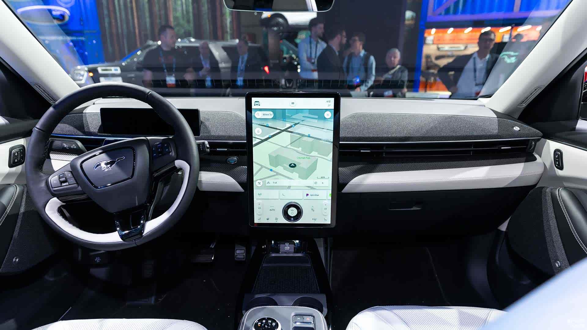 内饰方面,是Mustang Mach-E最吸引人的部分,样式采用了比较简约的设计语言,但车内整体构造一定是“简约而不简单”!Mustang Mach-E采用了一块大尺寸的全液晶仪表盘以及更大尺寸的一块中控屏幕,中控屏幕的尺寸为15.5英寸,值得注意的是,下方还有一个物理的调节旋钮,新车采用了福特SYNC系统,设计支持OTA升级,支持CarPlay和Android Auto。与此同时,变速箱也采用了旋钮式换挡,当然全新样式的三幅式方向盘,也让我们感到耳目一新。