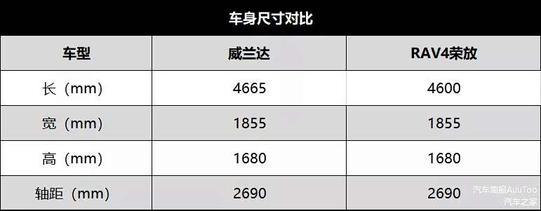 而在车身尺寸方面,两车基本相差无几,威兰达相比RAV4荣放在车长方面多出65mm,其余数据基本相当。