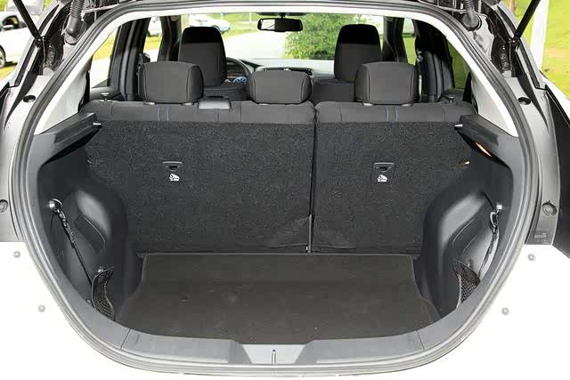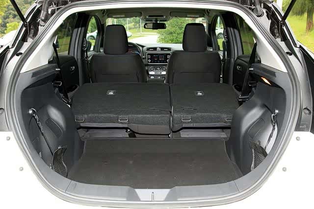 Leaf 行李箱容量是435公升,对比同级车是容量最大的,若需要更多空间则可将后排座椅倾倒来增加置物便利性。不过可以发现因为电池组在后座椅子下方,因此占据了不少空间,所以全部打平没办法呈现一个大平面的状况。