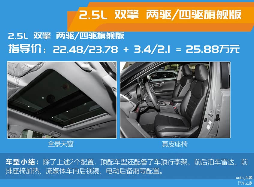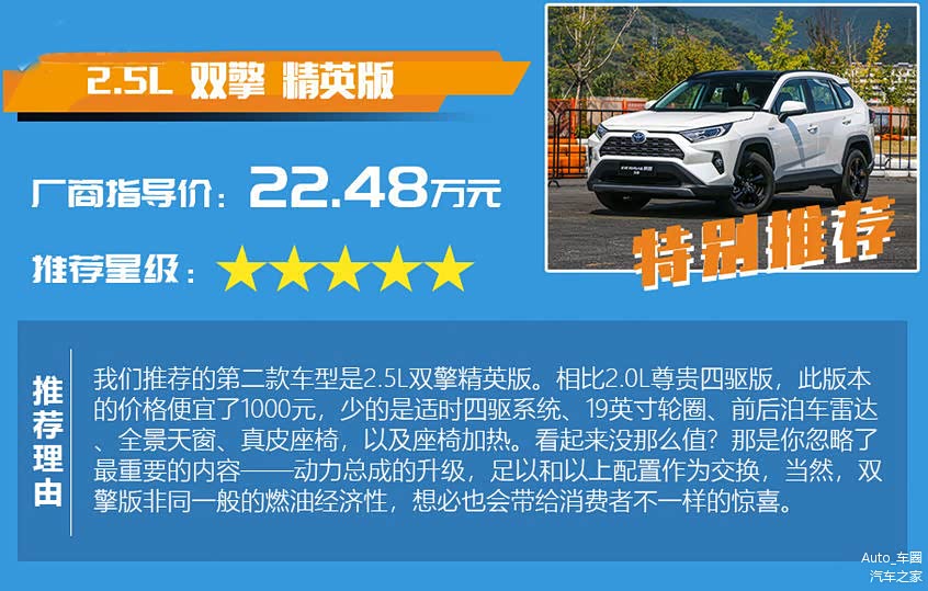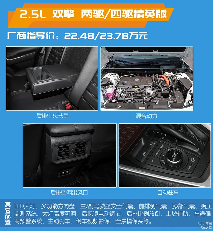 值得一提的是,2.5L双擎精英版比2.0L顶配更便宜,同时,花22.48万元就能体验到丰田最新的混动系统,想想也是稳赚不赔。虽然会少一些配置,但在全景天窗与更棒的动力总成之间,选择后者还是比较理智。