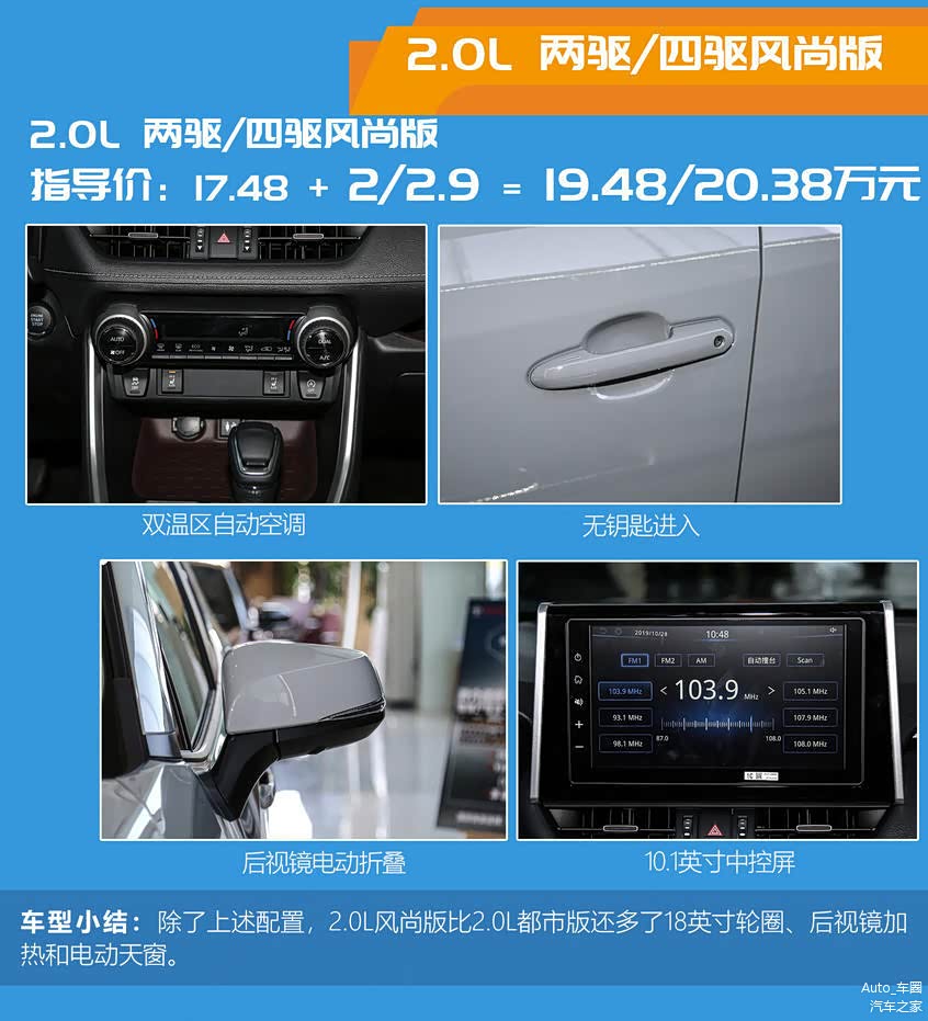 2.0L风尚版和四驱风尚版配置一致,我们将它们放在一起来说。2万元的加价,你能够get到10.1英寸中控屏、天窗、自动空调、电动调节座椅、全景摄像头等这些在日常生活中十分实用的配置,可以说是很值得。