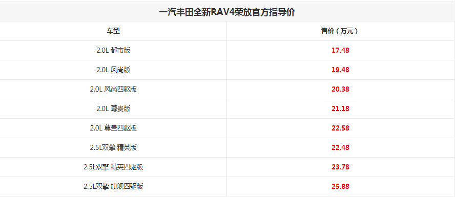 10月25日,2020款一汽丰田全新RAV4荣放正式上市。新车共推出8款车型,提供2.0L燃油版及2.5L双擎版,包含两驱和四驱,售价区间为17.48-25.88万元。