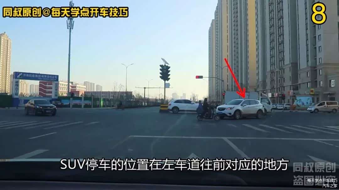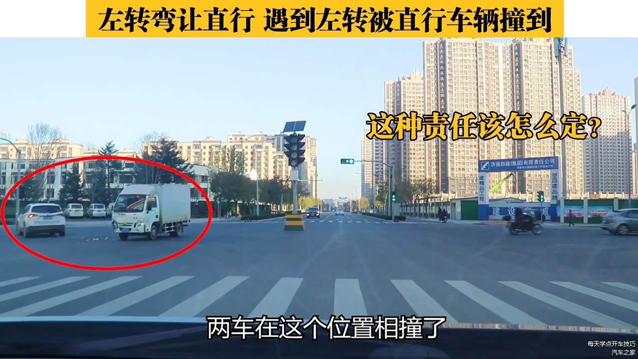 我现在左转弯,前面掉头回来再给大家讲解一下。现在从侧面角度看到,SUV停车的位置在左车道往前对应的地方,这说明它可能是在绿灯时看到对面厢卡开过来了,越过停止线后没有走到路口中间就抢先左转弯了,在左转弯时也许前面遇到障碍不得不停下车,而厢卡司机要么是走神了要么是判断SUV肯定能过,所以就撞到了一起。