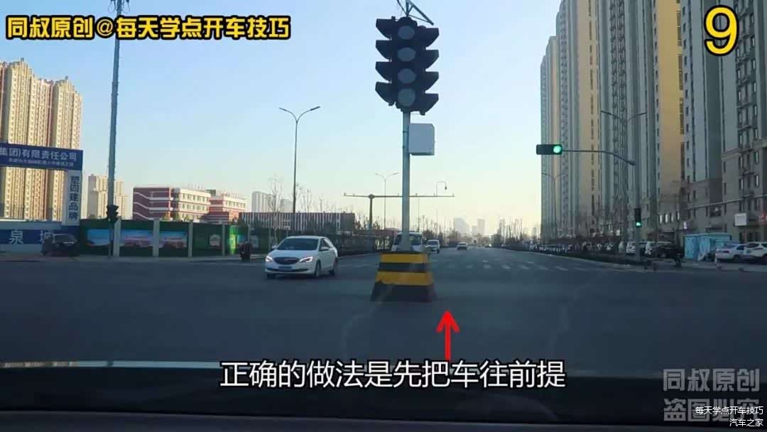 第三个场景告诉了我们,作为左转车辆一方要主动让行,让行的停车位置有讲究。往前提车不越过左边的中心线虚拟延伸线,即便是越过也不能影响对向车道行驶;往前提车的好处还有,就是不影响后面直行车辆通行,因为这个是左转加直行车道。