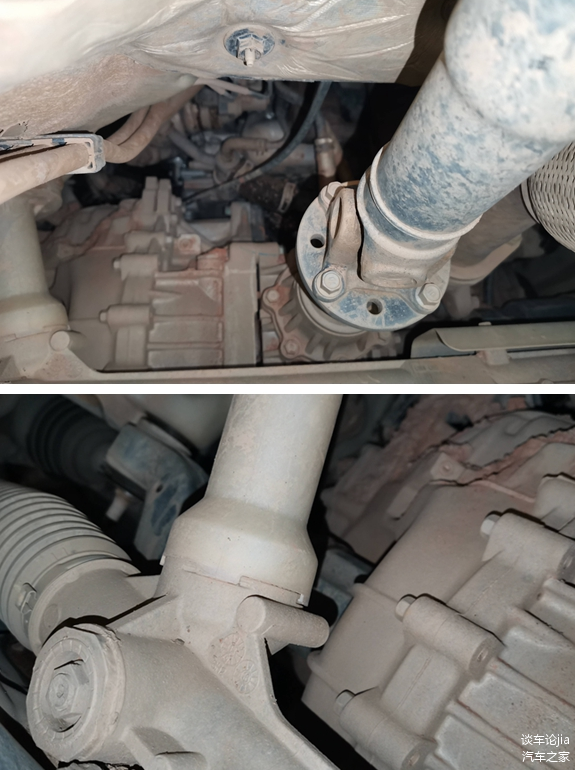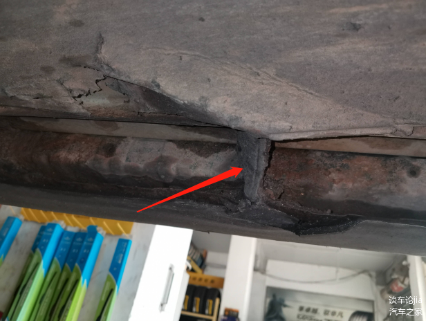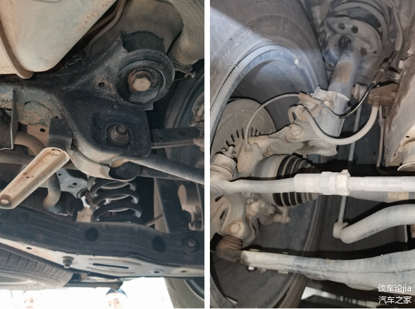 将车辆举升起来,可以看到底盘上有轻微锈蚀情况,许多部件都有剐蹭的现象,右侧轻微托底,导致踏板支架变形。