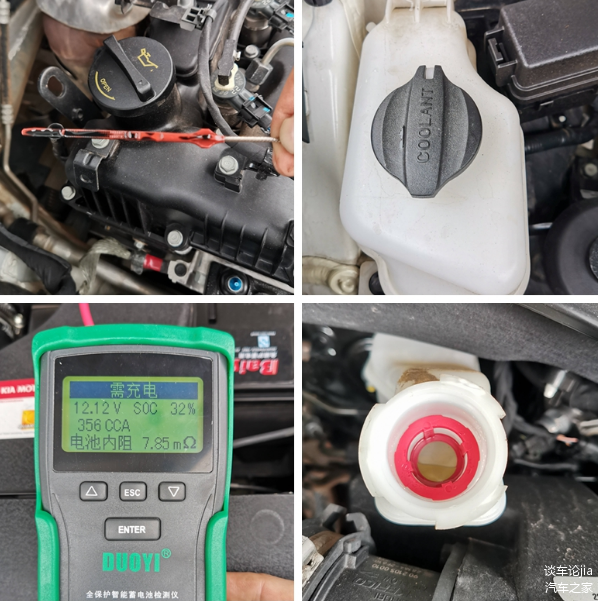 还剩一些常规功能性检测,发动机机油变质,液位正常;防冻液正常,电瓶电量不足,刹车油含水量正常。
