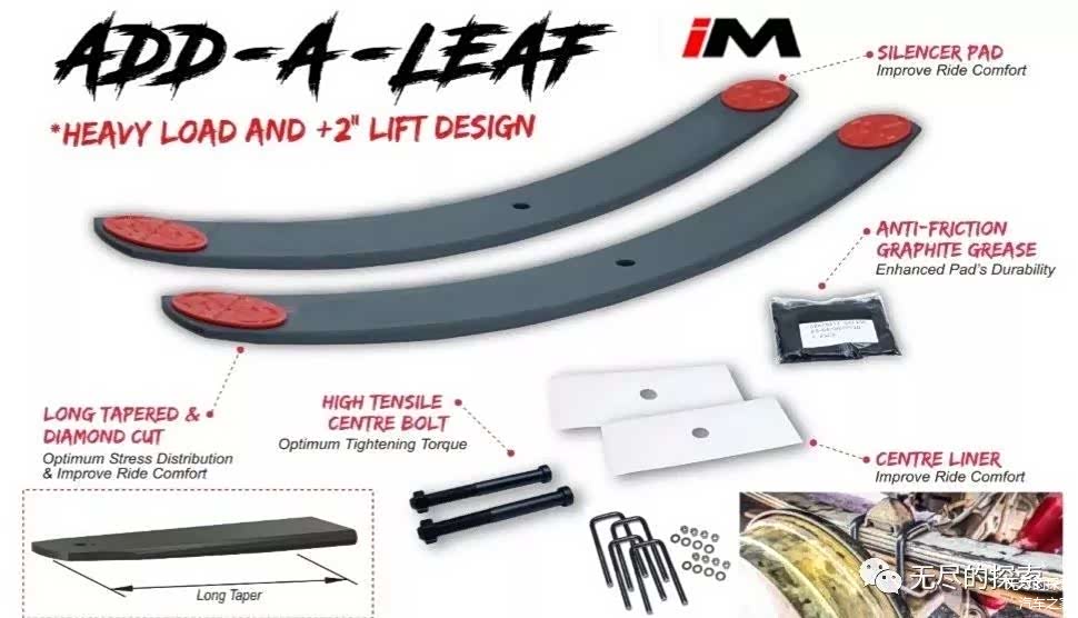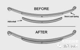 钢板悬架的改装我们这里所说的主要是指皮卡和硬派越野车;它们的改装目的或者说原因无非是两种,一个是增加负荷能力,一个是提高通过能力,或者兼而有之;因此它们的改装方式主要是更换整架钢板、增加一片更好的弹性钢板做主支撑或者换装加长的吊耳。