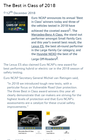 在E-NCAP网站上,2018年度最安全车型入围的三台车分别是奔驰A-Class;雷克萨斯ES;现代NEXO。