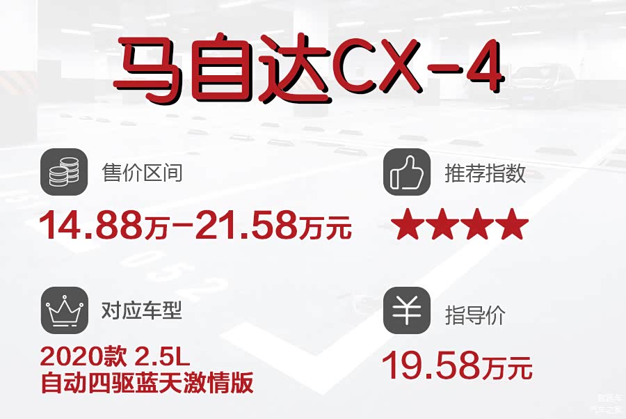 动力部分,2020款马自达CX-4提供2.0L与2.5L动力供选择,2.0L发动机的最大功率为158Ps/6400rpm,峰值扭矩为202N·m/4000rpm。2.5L发动机的最大功率为192Ps/6100rpm,峰值扭矩为252N·m/4000rpm。传动方面,新车则全系匹配6挡手自一体变速箱。综合来看,用不足20万的价格获得一款2.5L排量的马自达四驱SUV,其动态性能定不会令人失望。