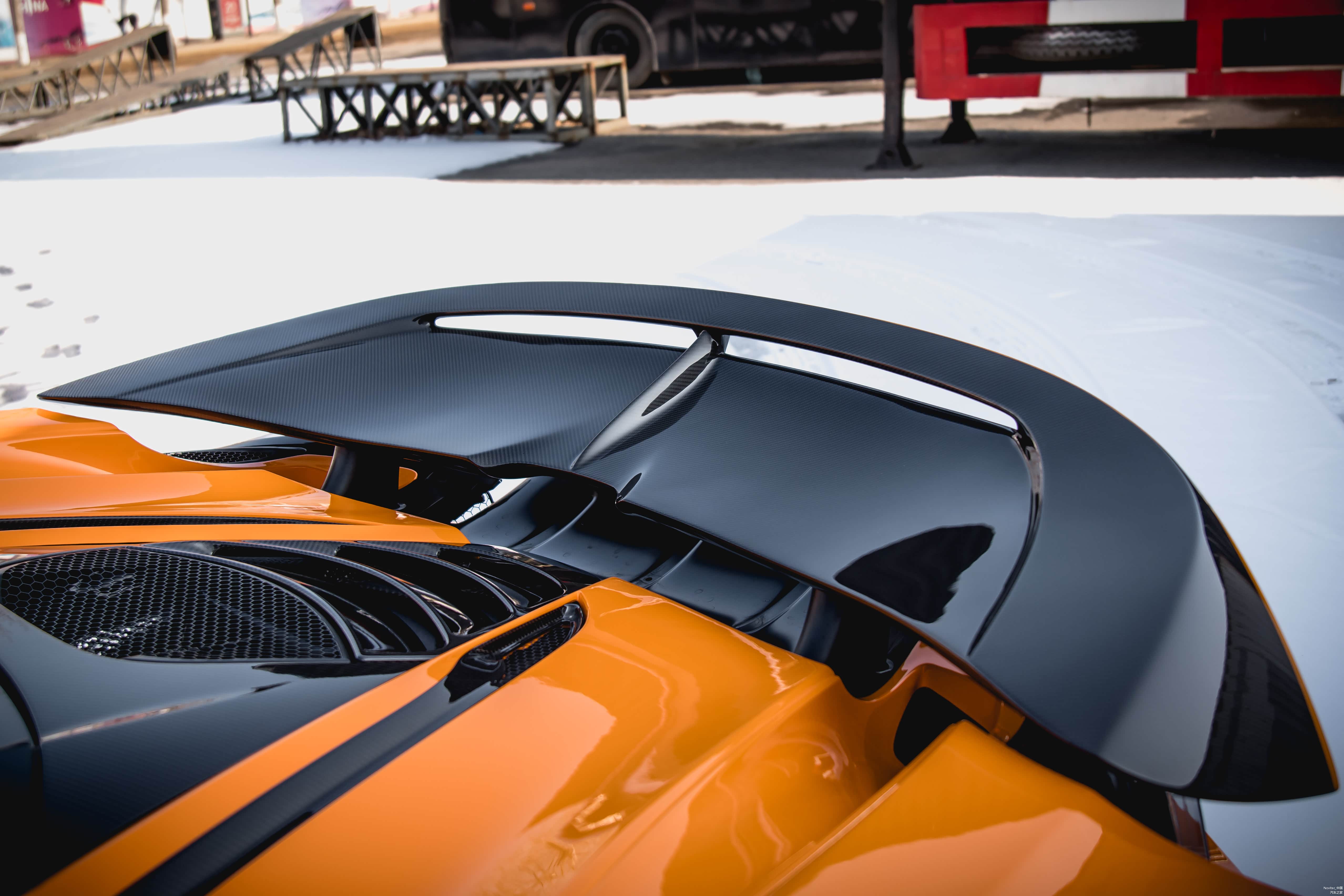 Novitec作为超跑御用改装品牌,此套McLaren720S NLargo包括:前杠、前唇、前叶子板、侧裙,后侧方套件、后杠贴片、尾翼、机盖、后扩散器。且套件的大部分采用碳纤维材料制作,从而大大的减轻了车身重量。其灵活地使用碳纤维,设计打造出与McLaren 720S原车曲线巧妙融合的宽体套件,处处充满了竞技气息。