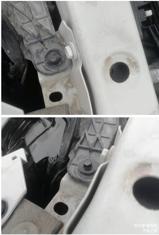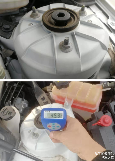 两侧减震器塔顶螺丝均未见拆卸痕迹,漆面数值也在正常范围内。