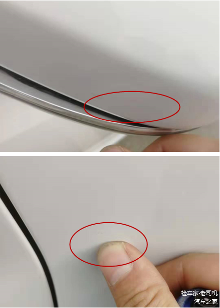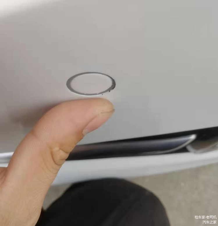 围着车子观察一番,发现前杠雷达探头周边的密封胶被喷上了白漆,保险杠漆面也有明显的二次喷漆痕迹。一般来说,车辆的前后杠属于刮蹭高发区,十台有九台前后杠都是有喷漆修复的。