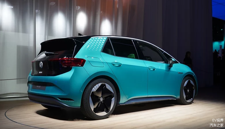 车身侧面,一根平直的腰线从前翼子板铭牌处贯穿充电口盖延伸至尾灯组,为侧面带来立体的光影效果。ID.3的A柱较为倾斜,并且配备了较大尺寸的前三角窗,带来更好的视野,C柱则添加了波点状纹路修饰。另外,ID.3采用了银黑双色的低风阻样式轮毂,有较高的辨识度。