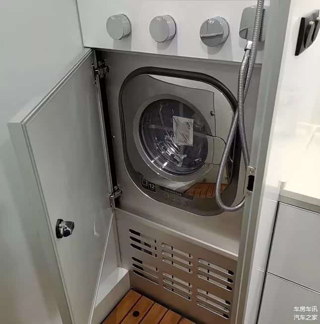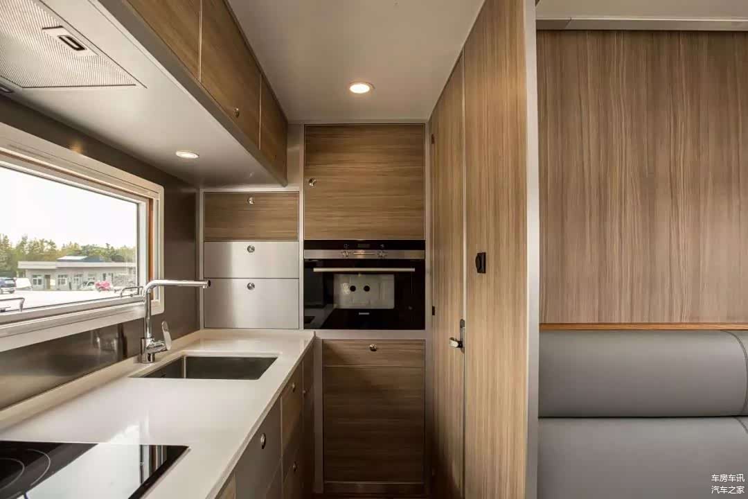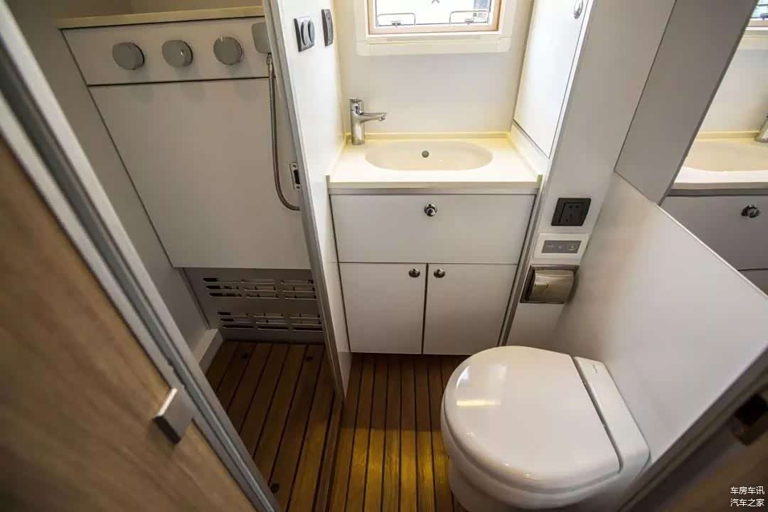 在客厅的后面就是车内的厨房区域和卫生间区域。从上述图可以看出,厨房和卫生间的空间都非常的大。
