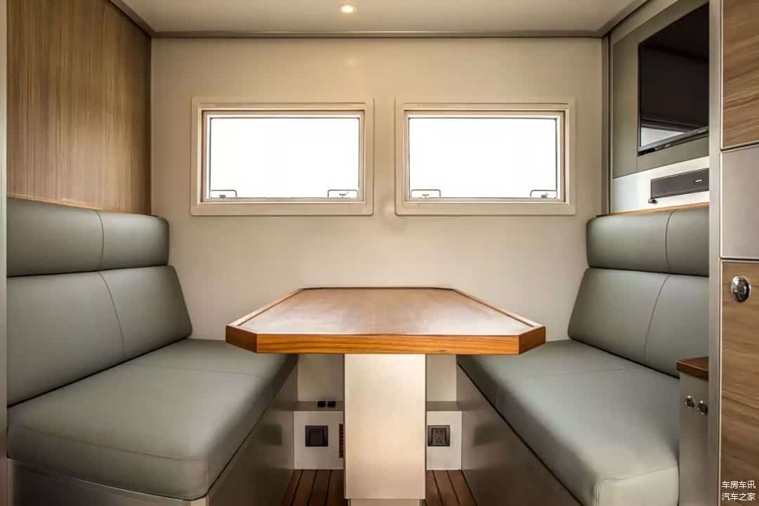 “撼路者”内部设计以原木色和白色为主,有一种美式的质感,驾驶室后面的内部空间分为会客和卧室区、厨房和卫生间。