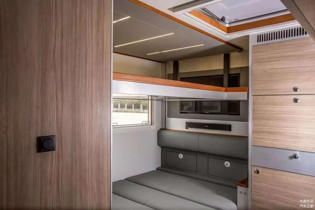 如上图,会客厅也是车内的睡卧空间,电动升降餐桌降下来与卡座沙发组合拼成沙发床(尺寸1950*1200mm),在卡座上方还有一张隐藏的电动升降吊床(尺寸为1900*1000mm),和下方的沙发拼床形成上下铺布局。