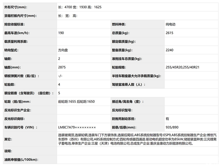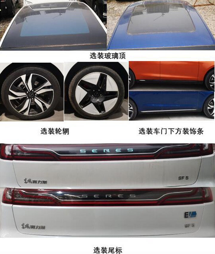 从工信部公布信息得知,SF5 EV的车身尺寸为4700*1930*1625mm,轴距为2875mm,整备质量2240kg。此外,该车采用了225/45 R20和255/40 R21规格的轮胎,并提供两款不同轮圈供消费者选择。