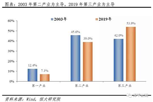 2019年第一、第二、第三产业分别占比7.1%、39%和53.9%,其中第一二产业分别较2003年分别下降5.3和6.6个百分点,第三产业提高11.9个百分点,分别拉动GDP增长0.2、2.2和3.6个百分点。