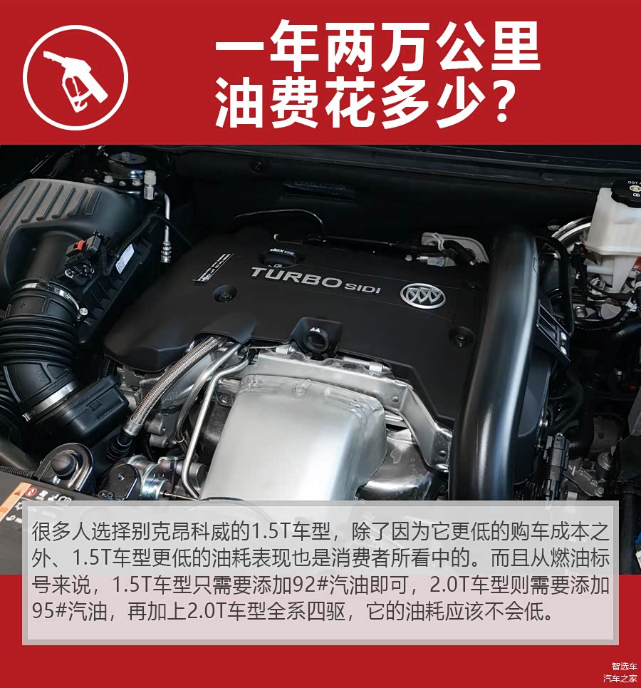 以上海地区为例,目前92#汽油单价6.28元/L、95#汽油单价6.69元/L,1.5T别克昂科威的真实油耗在8.6L/100km左右,2.0T车型的真实油耗在10.8L/100km左右。如果按照一年行驶2万公里,两款车的油费相差了3600多元,差异还是比较明显的。为了2.0T车型更好的动力体验付出更多的油费,值不值得只有大家自己说了算。