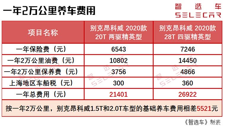 通过上面的计算我们可以发现,别克昂科威的1.5T和2.0T车型在购车费用、保养费用、燃油费用方面差异不小。那么按照一年行驶2万公里计算,1.5T车型和2.0T车型各自需要多少养车费用呢?