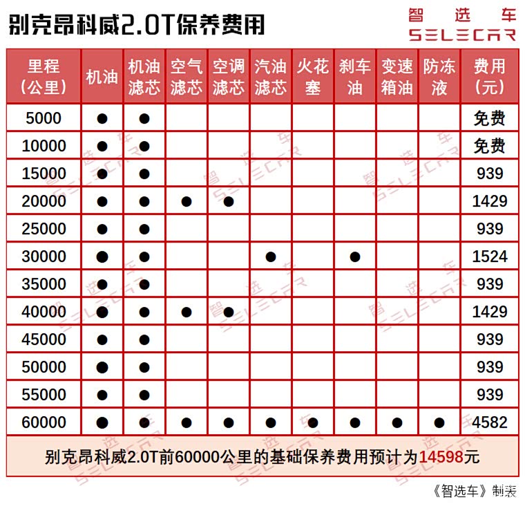 与1.5T车型不同,别克昂科威的2.0T车型每次保养需要更换5.4L机油,需要在4S店购买6L,所以在机油费用上,2.0T车型相比1.5T车型每次就要多支出234元。2.0T车型的小保养费用达到了939元,结合它5000公里的保养间隔,这样的小保养费用有点高。2.0T别克昂科威搭载了9AT变速箱,建议每隔6万公里更换一次变速箱油,采用循环机换油需要12L,费用在1500元左右,相比1.5T车型高出不少。最终前6万公里,别克昂科威的2.0T车型需要花费14598元的基础保养费用。