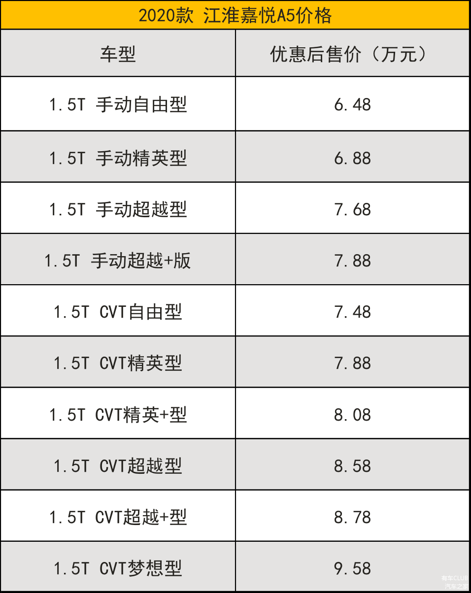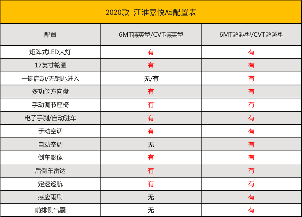 剩下的超越+型和CVT梦想型所增加的配置,考虑到实用性和价格,我觉得并不是必须拥有的配置。总体分析来看,嘉悦A5的精英型和超越型是值得购买的。至于手动版还是CVT版,就可以根据个人的用车需求来选择。除非你的预算非常充足,对配置的要求很高,这两款车型也是可以考虑的。