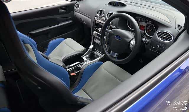 内饰布局方面,大体上维持福克斯的原状,欧洲钢炮哲学认为,钢炮首先是一辆日用车,所以福克斯RS并不像某些车厂的RS型号那样左拆右拆(保时捷、雷诺中枪),以牺牲舒适性配置换取所谓的轻量化和非性能车的必需品。因此最为醒目的莫过于一对蓝边Recaro RS特别版桶椅。这对座椅是以Recaro Sportster型号为基础,物料、颜色则由福特RS项目组精心搭配。在Recaro座椅系列之中,Sportster几乎是最受欧洲车厂欢迎的高性能版本OE型号,原因很简单,它能提供最基本的舒适性和长时间驾驶的放松,同时高耸的大腿侧撑以及腰撑,又可以在激烈拐弯的时候保持端正的坐姿,至少假如笔者买到了拥有这样的座椅的原装车,应该一辈子都没有换座椅的冲动了!