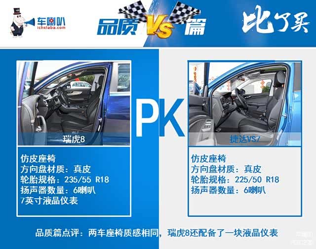 品质方面,两车都采用了皮质座椅,从VS7的中控台可以看出与大众相仿,倾斜式的设计更显运动感,而瑞虎8则稍显平淡,但是好在用料足、配置高。