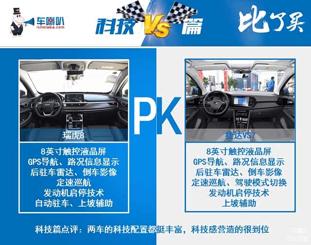 科技配置上,瑞虎8配备了一块8英寸触控液晶屏,瑞虎8三款高配车型配备了车联网和全景影像功能,同时它的图标也属于传统的设计,与VS7的扁平化风格大为不同。