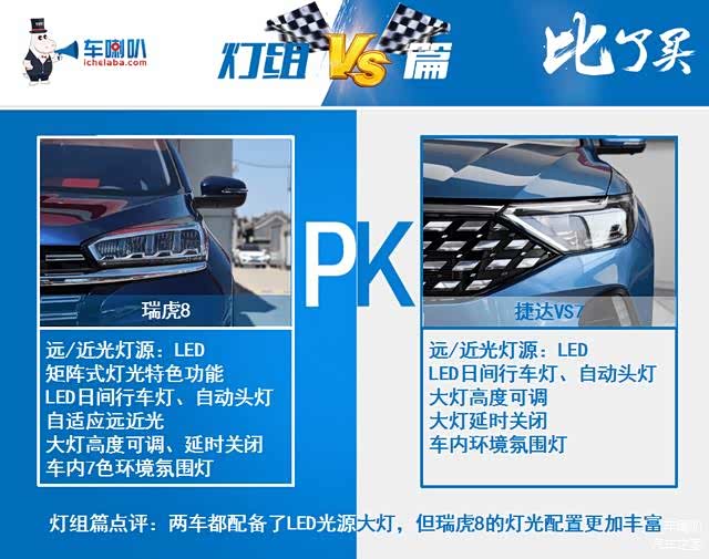 灯组配置上,两车都配备了LED远近光灯源、LED日间行车灯、自动头灯、大灯高度可调、大灯延时关闭、车内环境氛围灯等。值得一提的是,瑞虎8还配有矩阵式灯光,这一点要比捷达VS7更优。