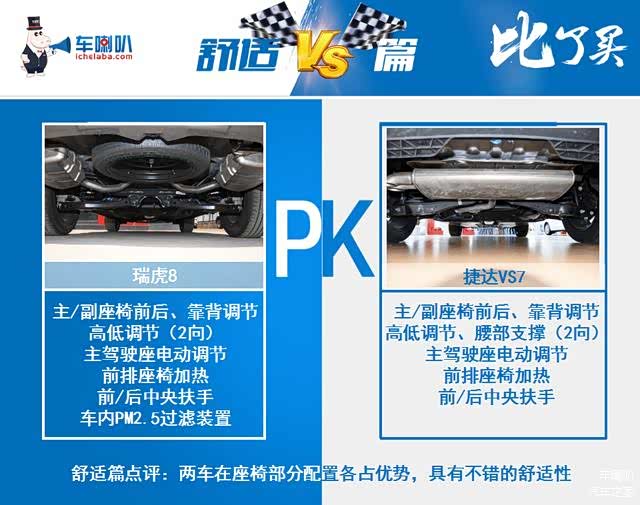 舒适性方面,瑞虎8除了最低配,均配备了仿皮座椅,从11.59万的精英版开始配备主驾电动调节、加热,电动副驾专属顶配。捷达VS7的座椅依然属于简约的造型,两款高配车型配备仿皮、电动座椅和腰部支撑,顶配独享座椅加热。