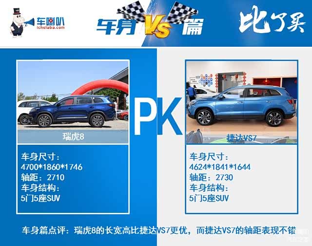 瑞虎8作为自主品牌中型SUV的主流选手,经常占据细分市场销量前三名,而 捷达VS7(图片 | 参数 | 询价)的上市可能会对它产生较大的影响,甚至成为最直接的竞争对手。相反瑞虎无论定位、还是十万左右的销量也都更容易成为新车捷达VS7的目标。那么相同价位的两车究竟会擦出什么样的火花呢,下面随喇叭哥一起看看详细对比!