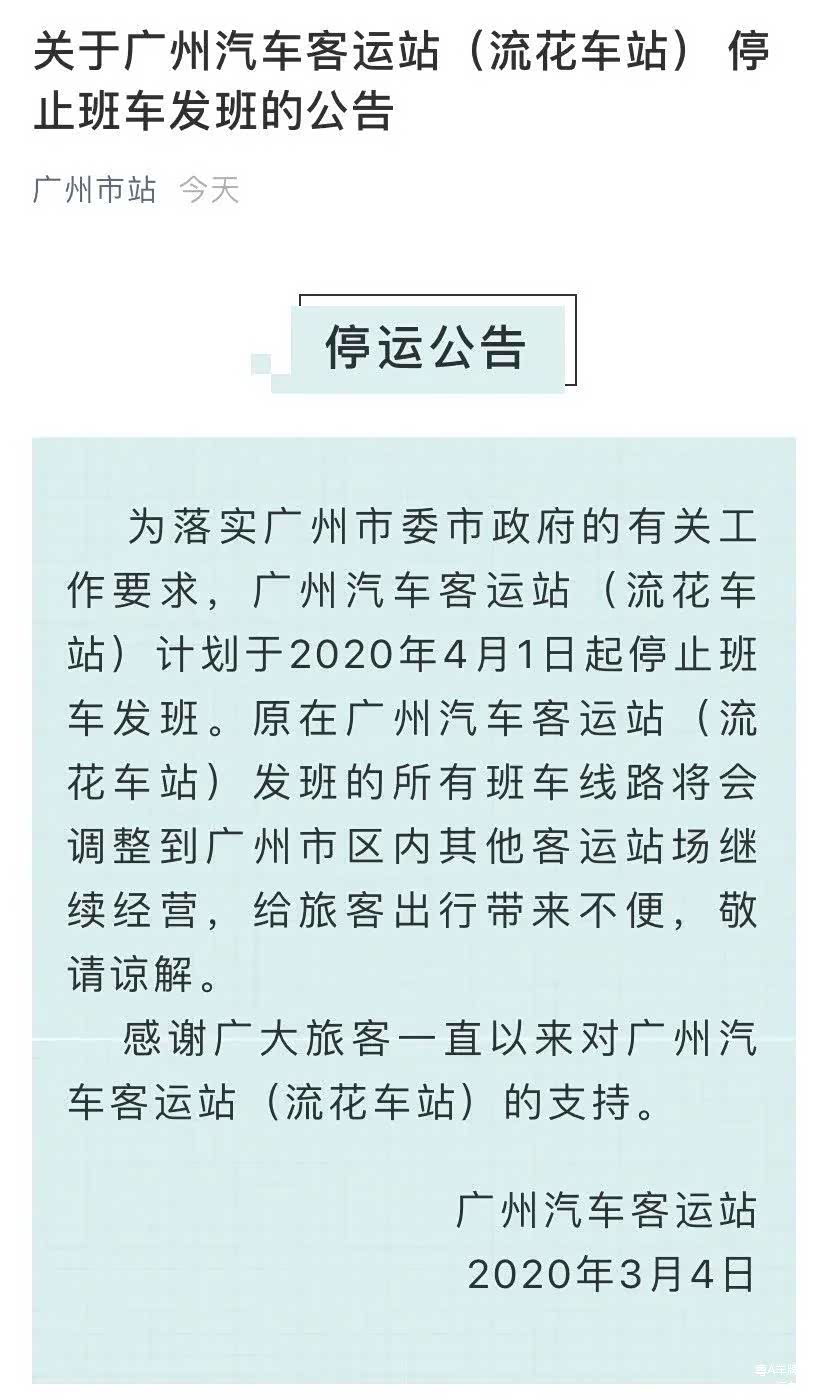 昨天,广州汽车客运站(流花车站,下简称市汽车站)发布信息称,计划于2020年4月1日起停止班车发班。也就是说,1985年成立的市汽车站历经35载后即将关停。